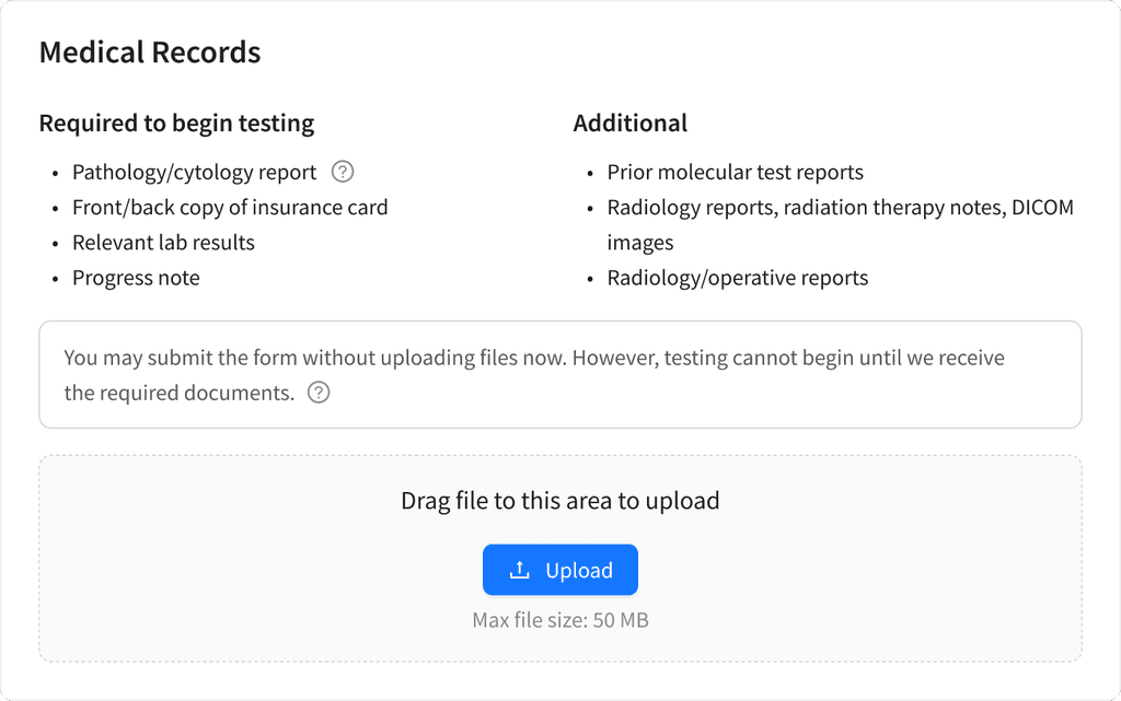 clarified label: “Required to begin testing” and highlighted upload-later option